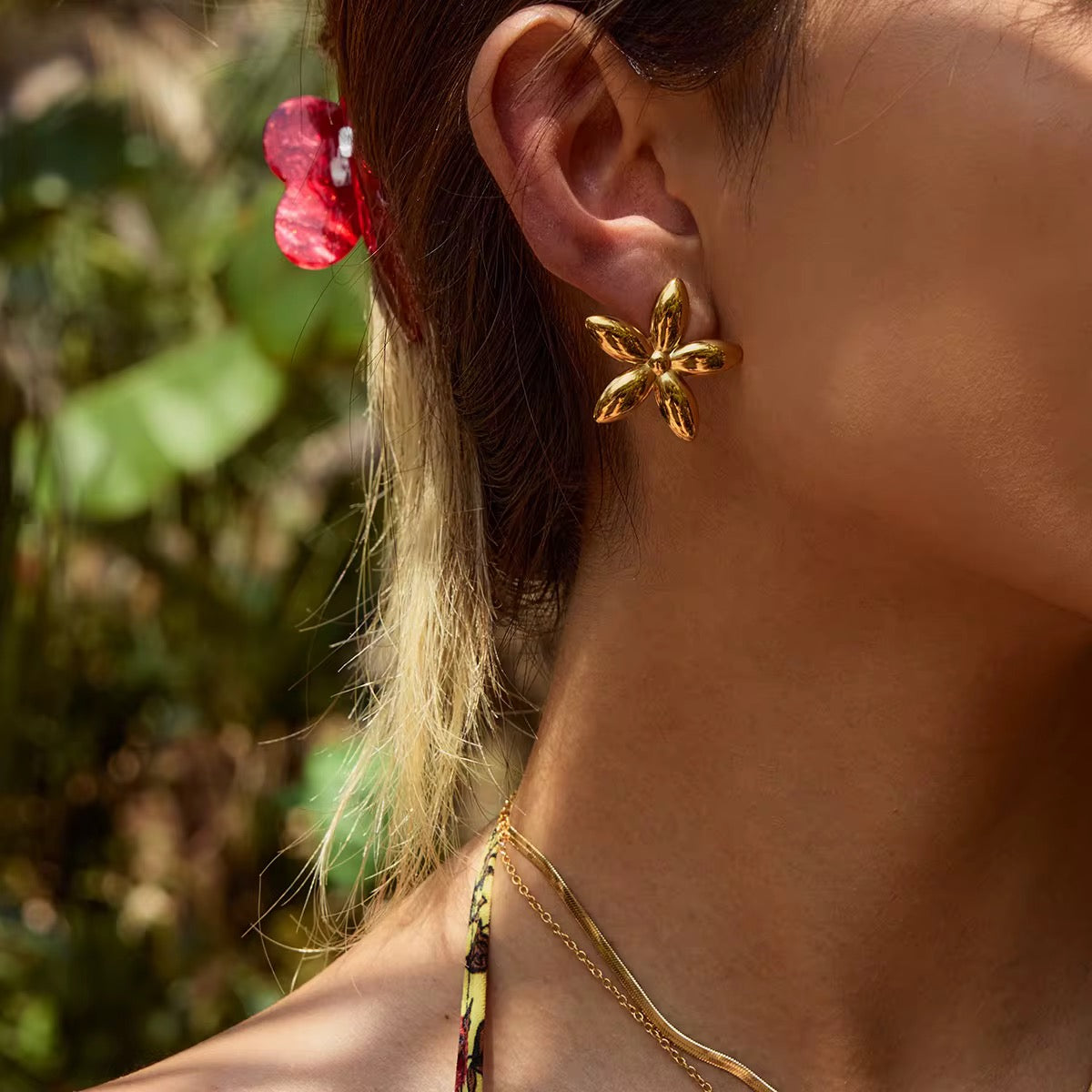 Sculptural, striking and feminine. Celebrates natural beauty with a golden flower of five petals in a polished finish, which brings a fresh and sophisticated air to any look.
