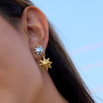 Cosmic, modern and radiant. Unites the contrast of two stars - one silver and one gold - in a hanging design that symbolizes the duality and balance of the universe. A versatile jewel that brings shine and personality.