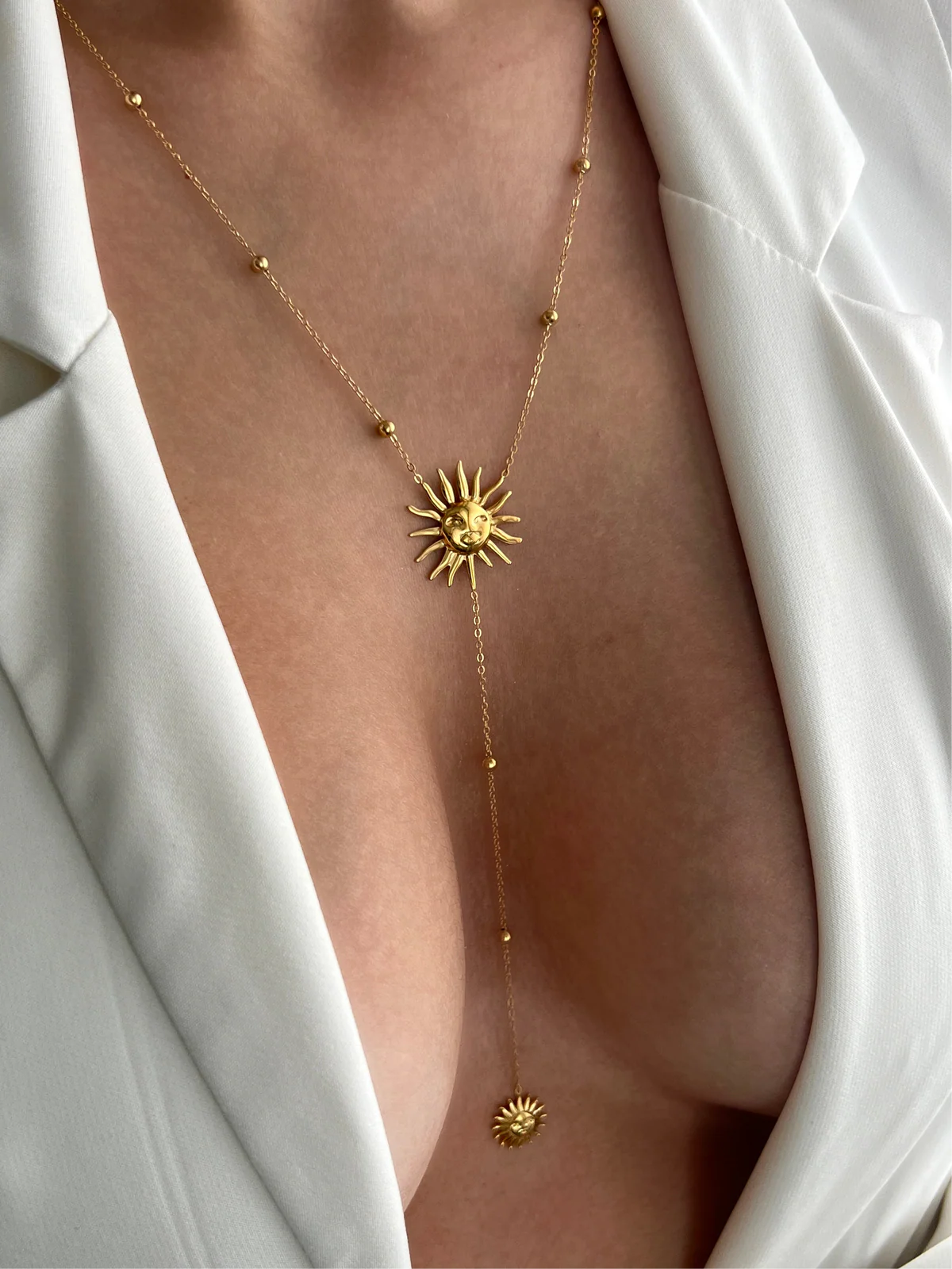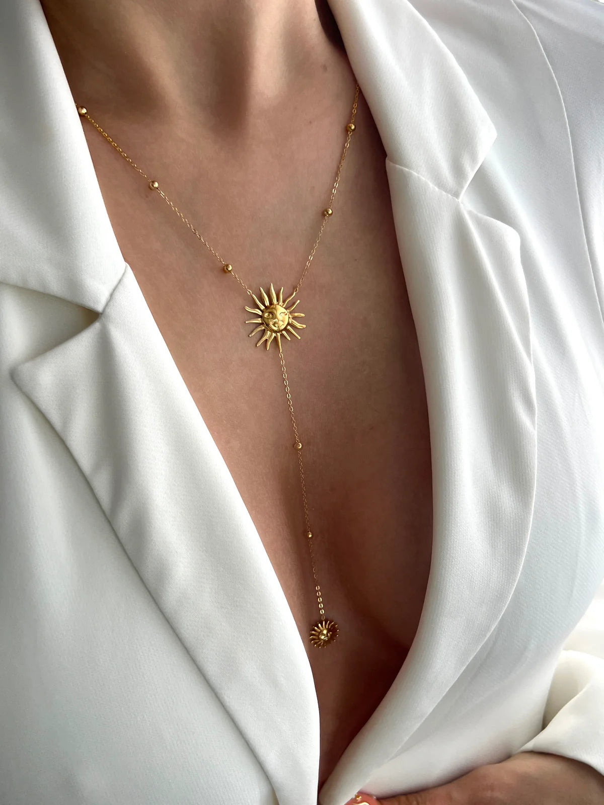 Bright, elegant and full of energy. Combines the symbolic strength of the sun with a lariat design that stylizes the neck and enhances any look with a golden and sophisticated touch.